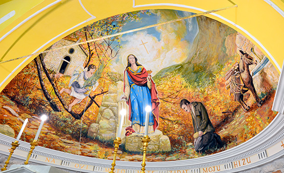ICONOGRAFIA: L'opera può iniziarsi a leggere dal punto centrale, ovvero l’apparizione della Santa sui resti di una antica costruzione religiosa, molto probabilmente eretta dai profughi Dalmati. A sinistra è riportato un evento successivo, cioè con l'edificazione della cappella attuale dedicata a Santa Lucia. A destra il momento dell’apparizione durante lo scorrere della vita quotidiana del tempo con il momento del mulo che si disseta alla fonte.